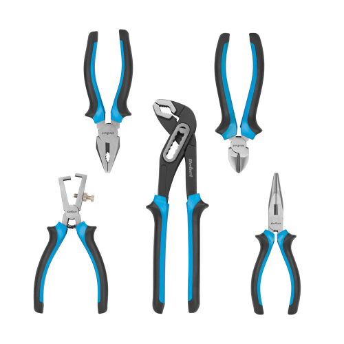 Zestaw szczypce-kombinerki 5szt.Często majsterkujesz w domu? Nasz zestaw szczypiec-kombinerek (5 szt.) będzie idealnym urozmaiceniem Twojej pracy! Zawiera pięć kluczowych narzędzi, które zaspokoją wszystkie Twoje potrzeby warsztatowe. W skład zestawu wchodzą: kombinerki uniwersalne, szczypce proste, szczypce hydrauliczne nastawne, szczypce do ściągania izolacji oraz szczypce tnące boczne.